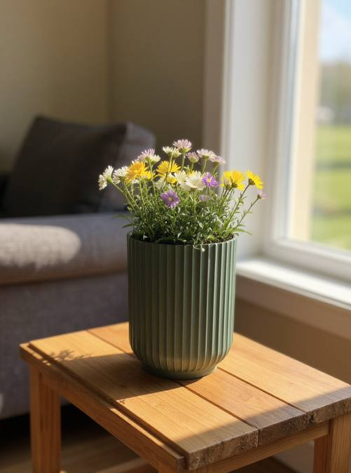 Durch den präzisen 3D-Druck aus hochwertigem PLA entsteht eine klare Formensprache mit feiner Oberflächenstruktur. Die Vase ist bewusst für Trockenblumen, Gräser oder Kunstblumen konzipiert und eignet sich hervorragend als dekoratives Element im Wohnzimmer, Büro oder Schlafzimmer.